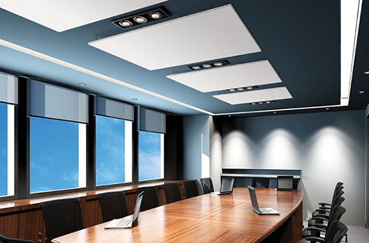 Los paneles acústicos en techo pueden instalarse fijos, directamente en el techo del espacio a insonorizar o bien suspendidos. Si el espacio u oficina cuenta con unos techos altos es cuando se optará por la opción de los paneles acústicos en suspensión, para de esta manera reducir el espacio en el que el ruido rebota y mejorar la acústica. Estéticamente mediante combinación de colores y la elección de formas se pueden conseguir resultados espectaculares.